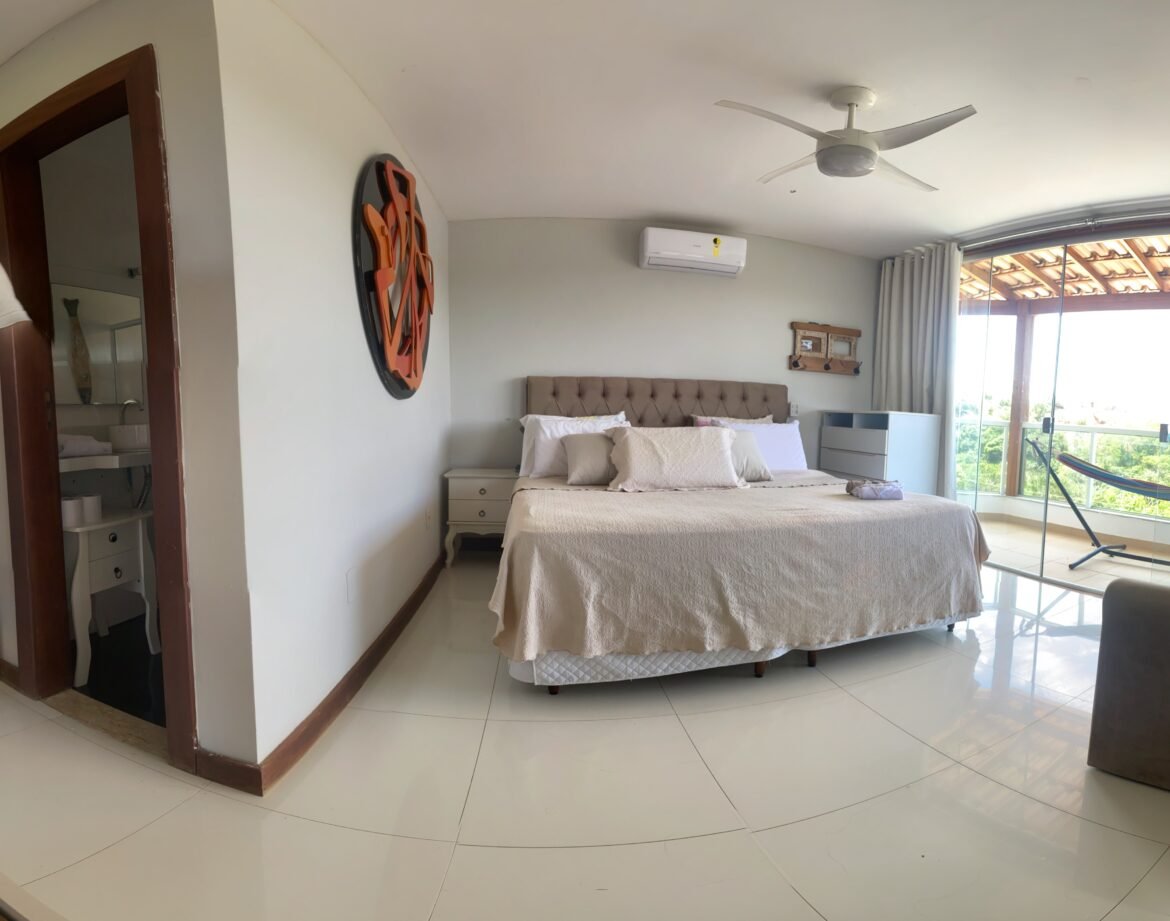 A casa possui 2 quartos, sendo 1 suíte, com ar-condicionado em todos os ambientes.